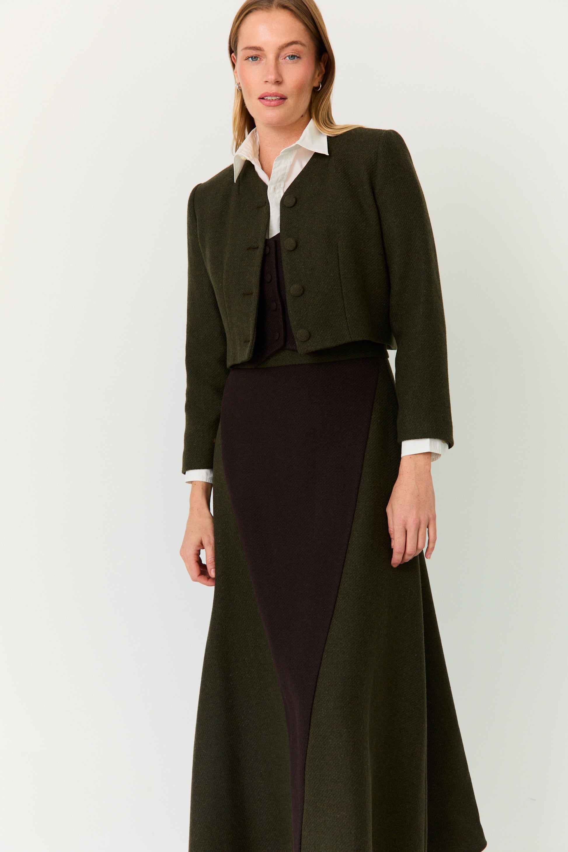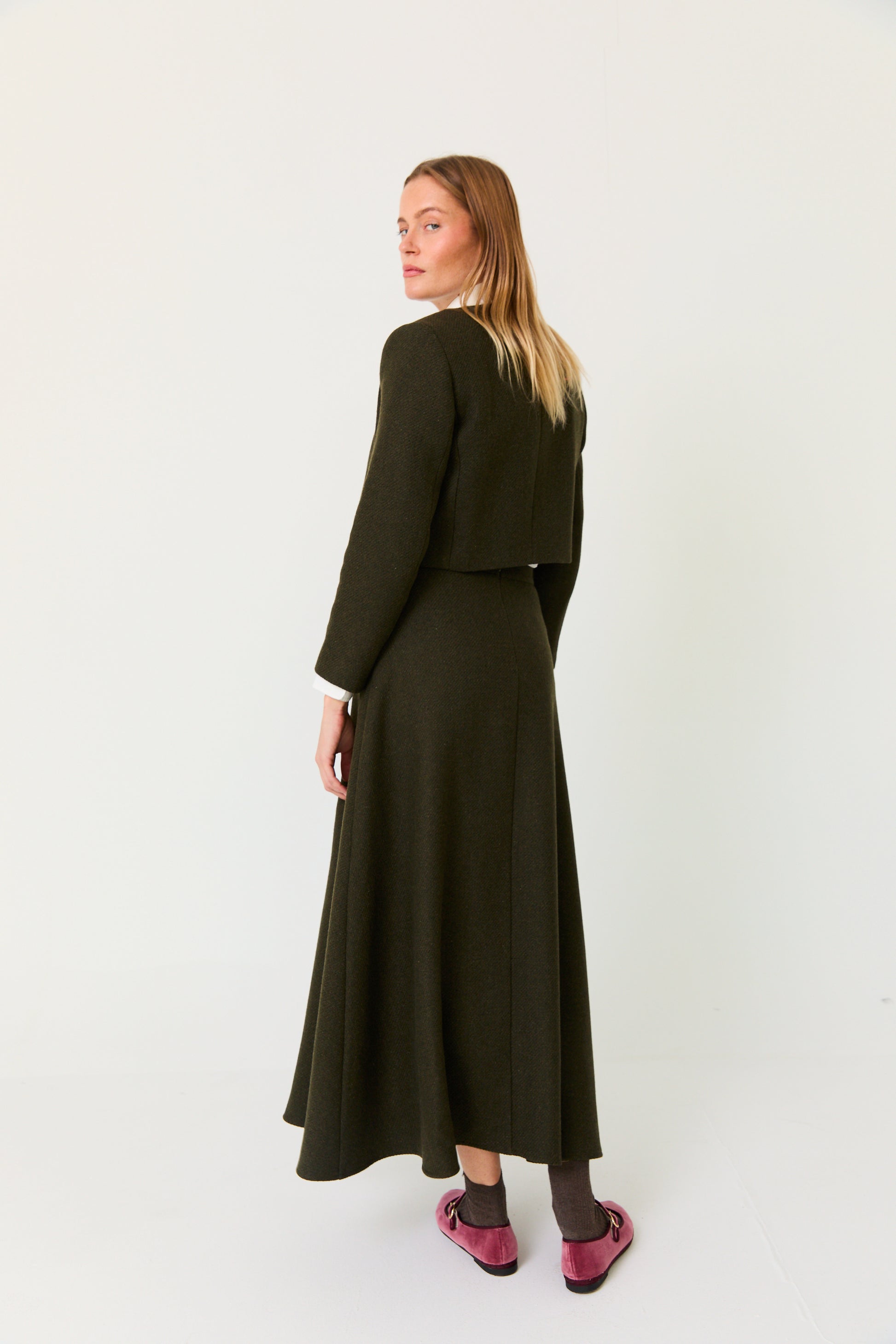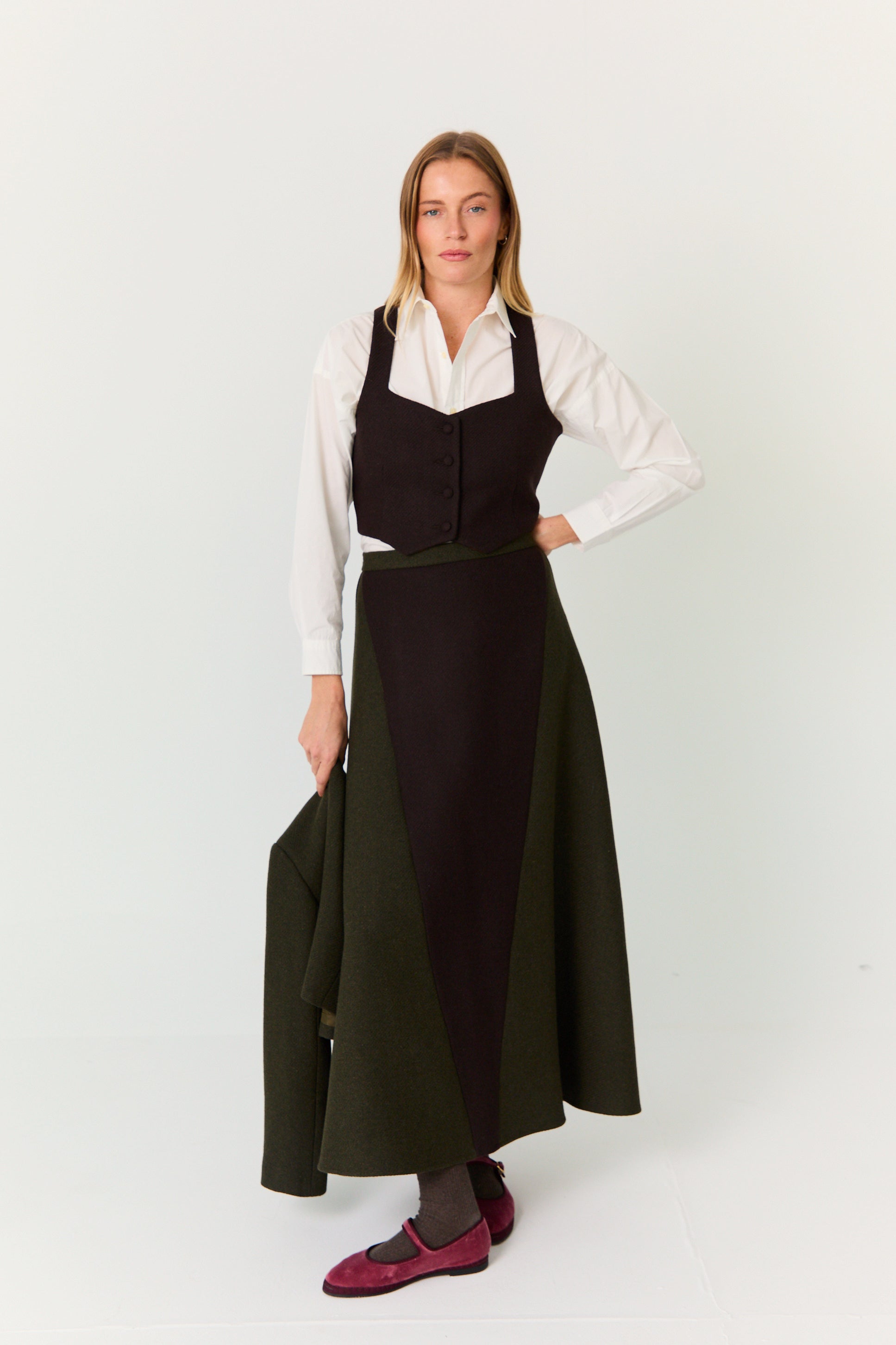 La Falda Circus 01 es un emblema de Copines. Su silueta amplia y movimiento sereno la vuelven una pieza atemporal, símbolo de la elegancia natural del campo.