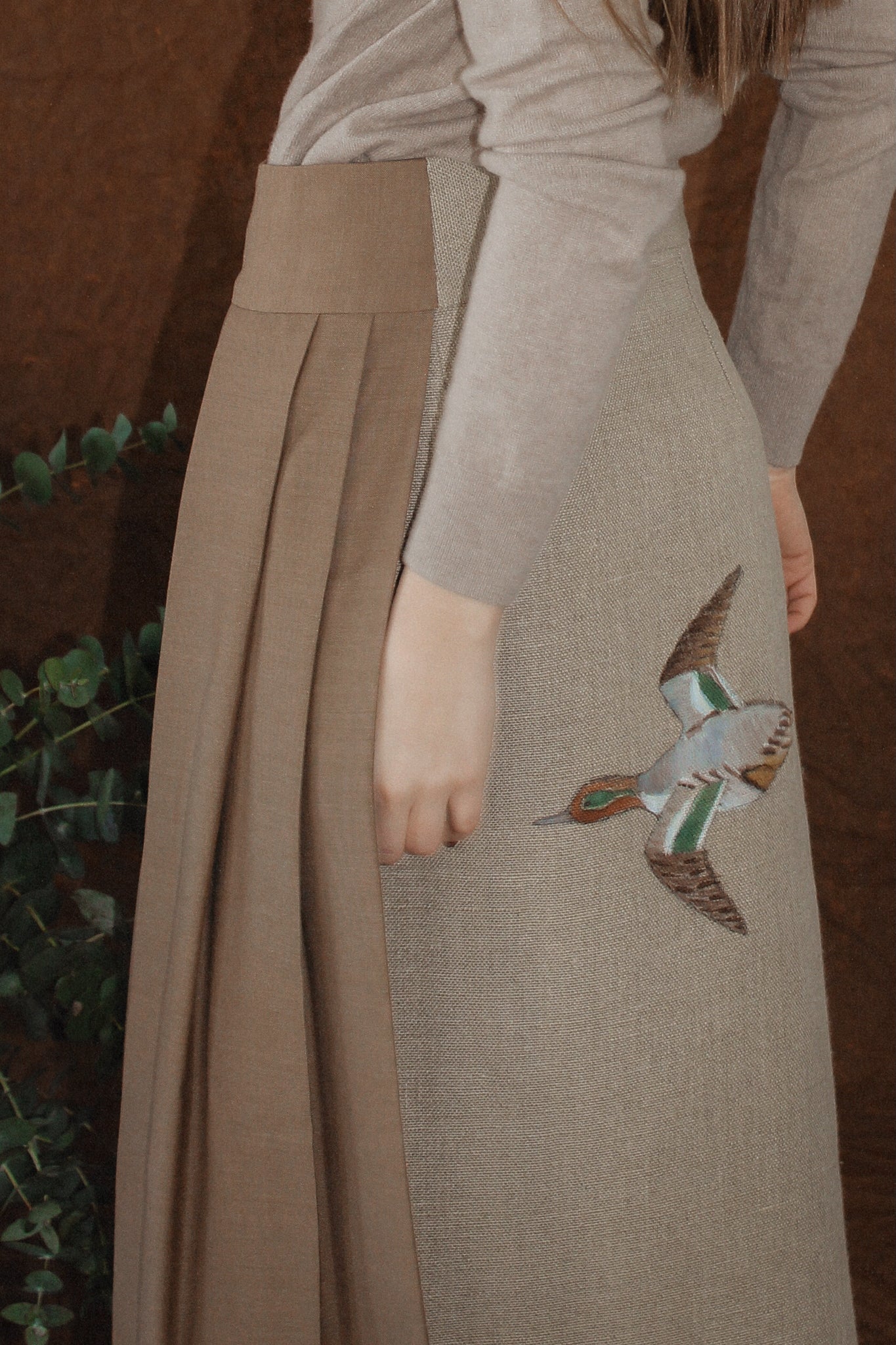 La sobrefalda esta confeccionada con 100% lino y el faldón lateral en lana virgen marrón