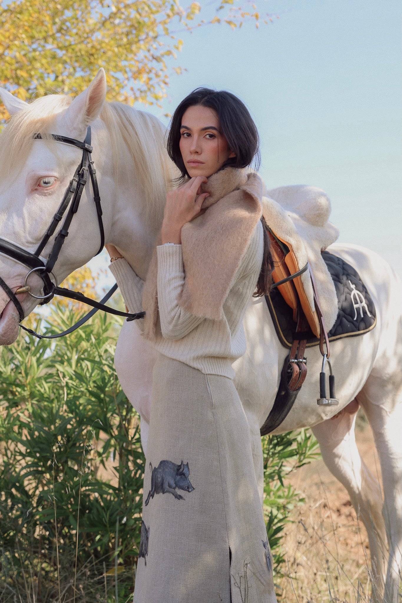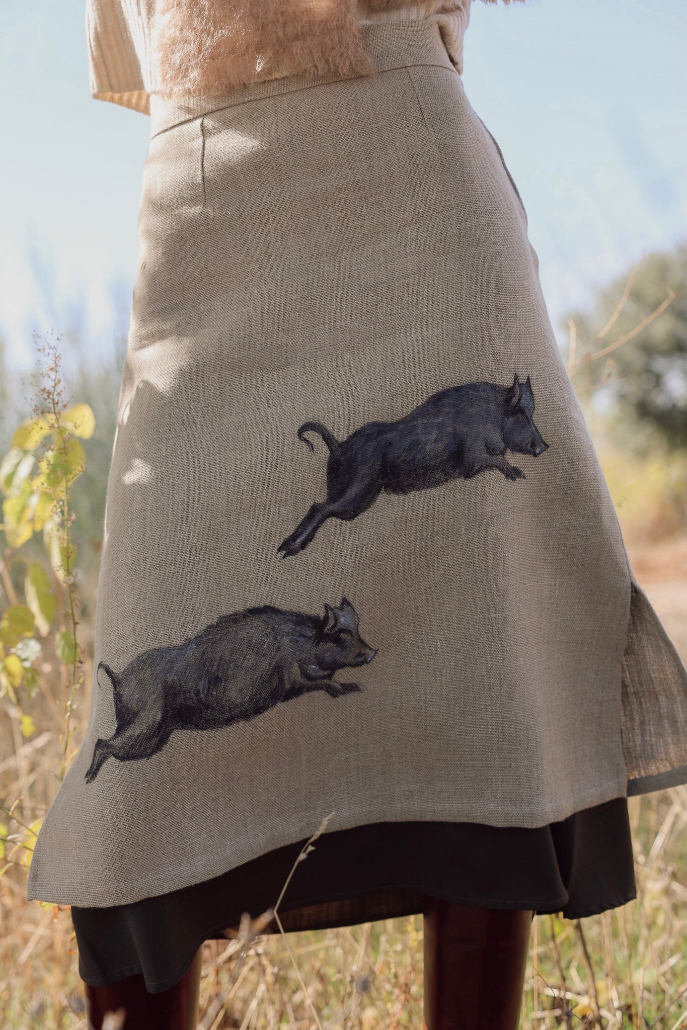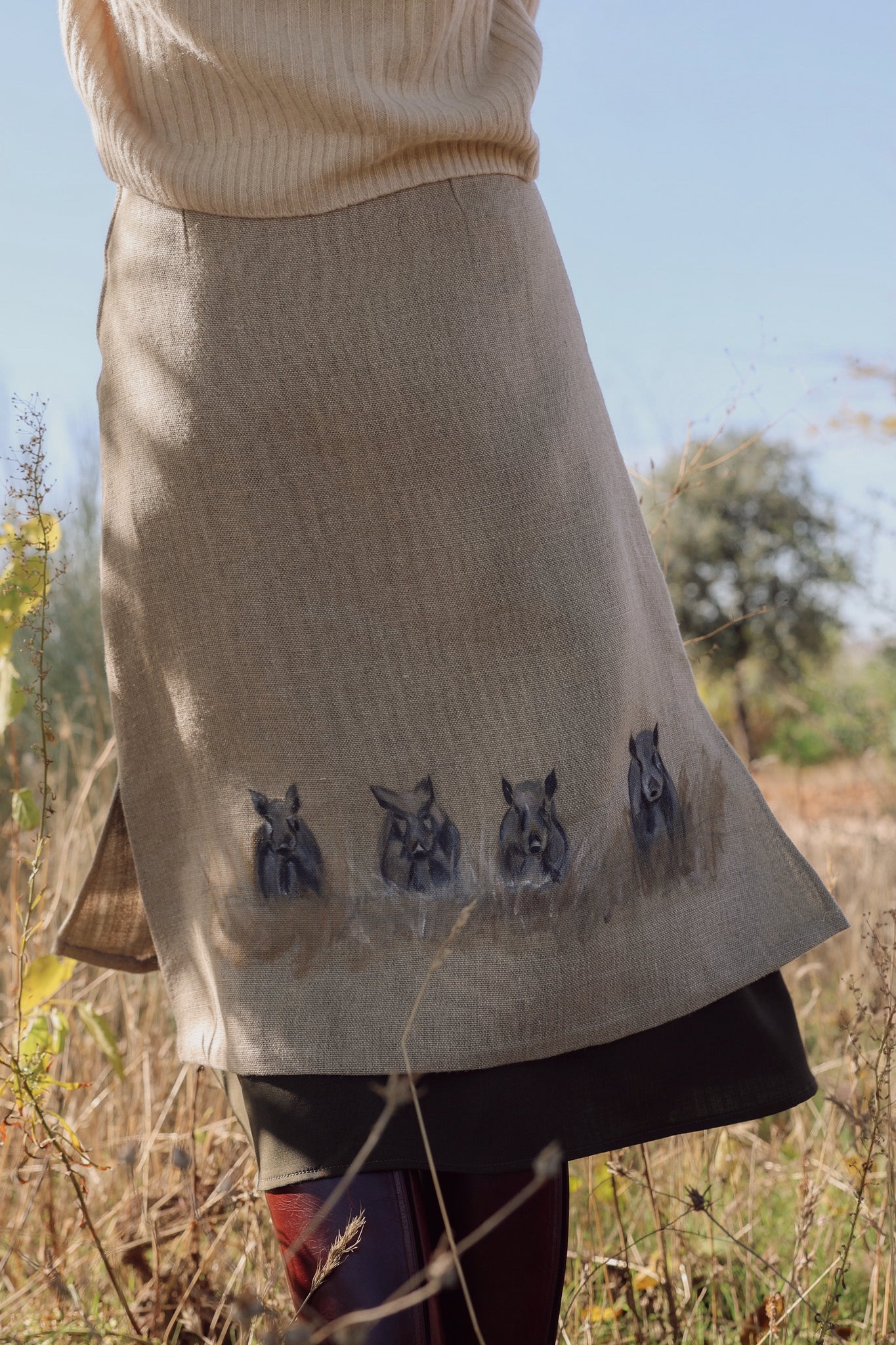 La falda Piara de Guarros es una pieza exclusiva diseñada íntegramente por Copines, donde la naturaleza, la artesanía y el diseño se unen en una pieza de carácter único.