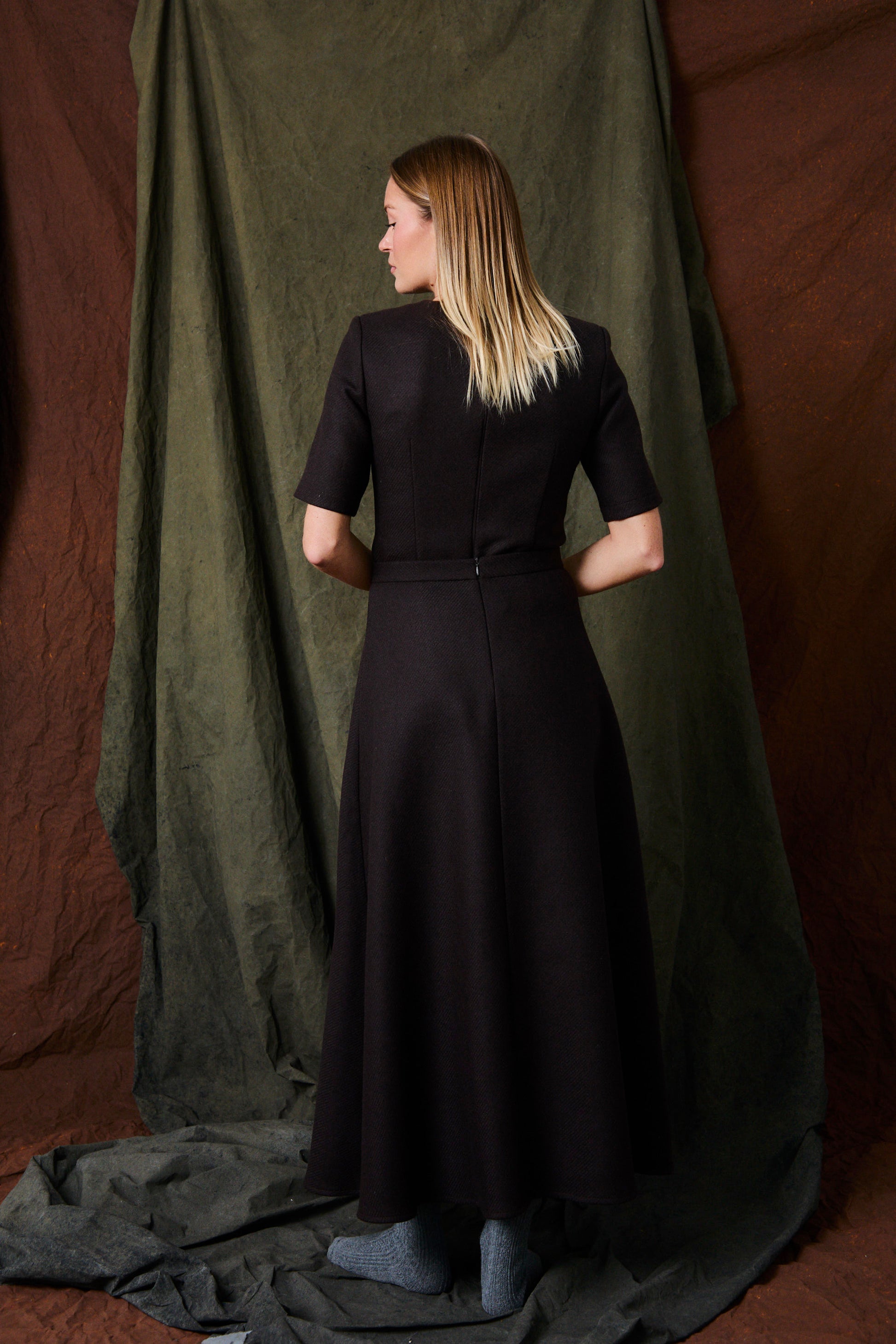 Falda larga confeccionada en lana color marrón profundo. Su corte limpio y estructurado estiliza la silueta y aporta sofisticación atemporal.